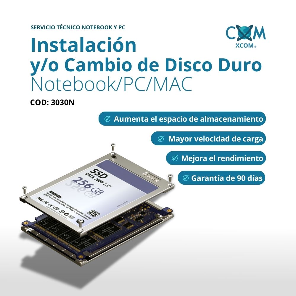 Si necesitas más espacio de almacenamiento o tu disco duro actual se ha dañado, nuestro servicio de Instalación y-o Cambio de Disco Duro para Notebook, PC y MAC es la solución que necesitas. En nuestro servicio, contamos con una amplia variedad de discos duros de alta calidad y compatibles con diferentes marcas y modelos de notebooks, PC y MAC. Además, nuestro equipo de técnicos especializados se encargará de la instalación o cambio del disco duro de manera rápida y cuidadosa, asegurándose de que tu dispositivo esté funcionando correctamente antes de entregártelo. También podemos asesorarte en la elección del disco duro adecuado para tus necesidades, desde discos duros HDD convencionales hasta discos duros SSD de alta velocidad. Confía en nosotros para la instalación o cambio de tu disco duro y disfruta de un almacenamiento ampliado y un mejor rendimiento en tu dispositivo Notebook, PC o MAC. Contáctanos hoy mismo para obtener más información sobre nuestro servicio de instalación y cambio de disco duro!